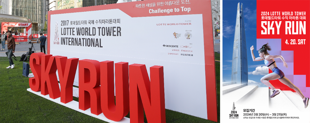 2017년 4월 23일, 제1회 롯데월드타워 국제 수직마라톤대회(이하 스카이런)가 개최됐습니다. 호주 출신 마크 본 선수가 15분 44초 51로 남자 우승을, 수지 월샴 선수가 18분 47초 23의 기록으로 여자 우승을 차지했습니다. 국내외 언론을 비롯해 수많은 SNS 채널을 통해 스카이런 대회가 알려졌고 롯데월드타워를 상징하는 시그니처 이벤트로 자리매김하게 됐습니다.