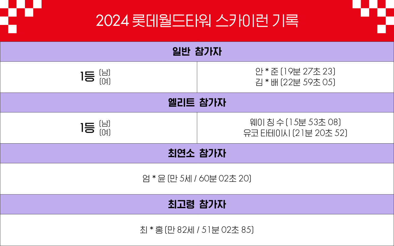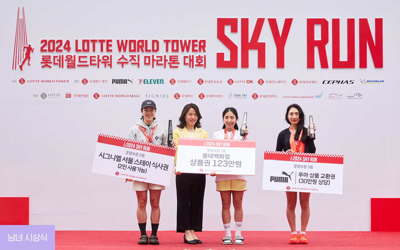 기록으로 봐도 알 수 있듯 스카이런 대회는 남녀노소 누구나 참여할 수 있습니다. ‘무릎 나간다’, ‘저 높은 곳을 도대체 어떻게 걸어서 올라가?’ 다 맞는 말일 수 있습니다. 하지만 한 번쯤 도전해 볼만한 대회입니다. 키즈런을 포함해 2천여 명의 참가자 중 미완주자는 단 21명입니다. 등산 후 정상에서 맛보는 성취감을 한 번쯤은 느껴봤을 겁니다. 롯데월드타워 정상에서 맛보는 성취감도 색다른 경험임이 틀림없죠.