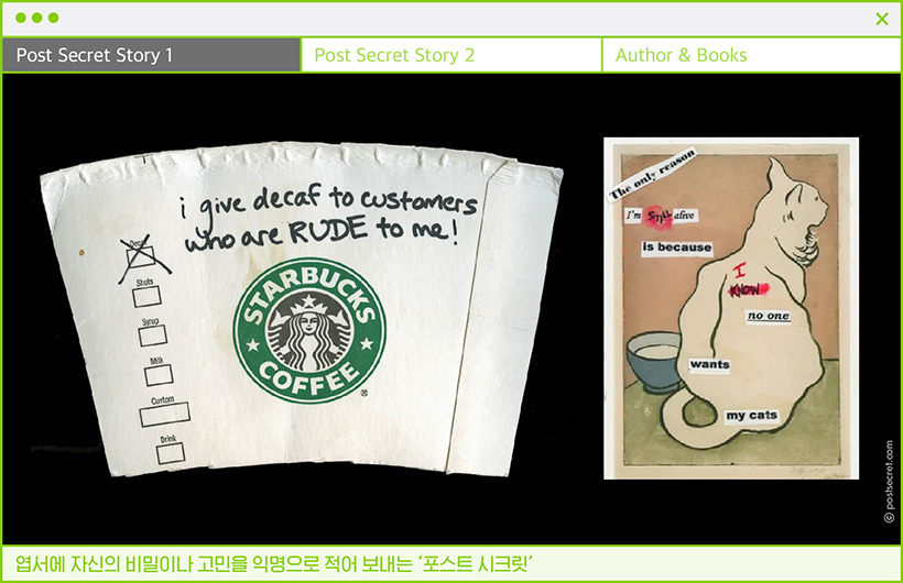 누구나 비밀은 있다. 아무에게도 말 못 할 나만의 비밀. 하지만 역설적으로 가장 가까운 사람에게 털어놓을 수 없는 비밀은 나를 전혀 모르는 사람들에게는 털어놓을 수 있다. 포스트 시크릿(Post Secret) 프로젝트는 여기서 시작됐다. 2004년 미국의 예술가 프랭크 워런은 수신 주소와 ‘비밀을 털어놓으라’는 문구를 적은 빈 엽서 3천 장을 배포했다. 아무에게도 말한 적 없는 비밀이나 고민을 익명으로 털어놓게 한 것. 프로젝트 시작 후 5년 동안에만 15만 통이 넘는 엽서가 도착했다.