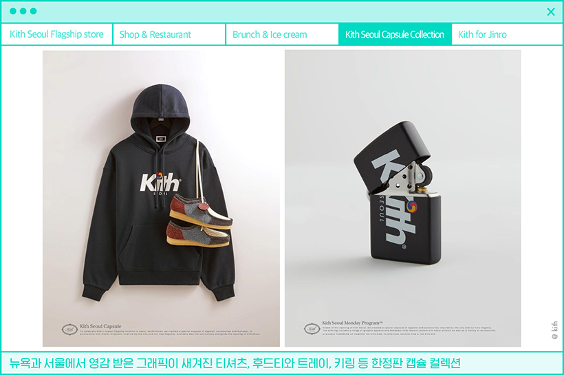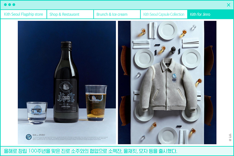 KITH는 2011년 신발 편집숍으로 시작한 브랜드로, 스트리트 브랜드이지만 차분하면서도 모던함을 더한 것이 특징이다. 무엇보다 나이키, 아디다스, 몽클레르와 같은 패션 브랜드는 물론이고 BMW나 코카콜라, 스타워즈 같은 비패션 브랜드와의 콜라보를 통해 전 세계 패피들이 사랑하는 브랜드로 성장했다. 콜라보 장인답게 이번 KITH 서울 오픈을 기념한 한정판 ‘KITH 서울 캡슐 컬렉션’도 선보였다. 88올림픽의 태극부채가 떠오르는 후드와 티셔츠, 트레이, 키링 등에 더해 창립 100주년을 맞이한 진로 소주와의 컬렉션도 눈길을 사로잡는다. 100년 된 두꺼비 옆 KITH 네 글자는 힙 그 자체!