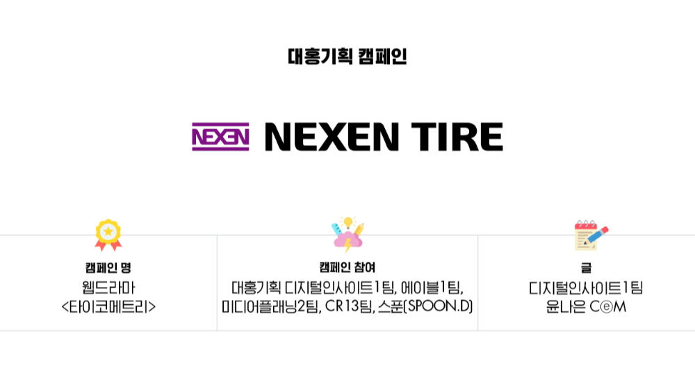 넥센타이어 웹드라마 <타이코메트리>는 매주 목요일 오전 10시에 넥센타이어 공식 유튜브 채널에서 새로운 에피소드가 공개되니 많은 관심과 응원을 부탁드린다. 마지막으로 이 자리를 빌려 지금도 본 캠페인을 위해 열심히 일하고 있는 대홍기획과 스푼(SPOON.D), 좋은 아이디어와 퀄리티로 항상 노력해주시는 제작사, 믿고 맡겨주시는 넥센타이어 광고주분들께 진심으로 감사드린다. 고맙습니다!