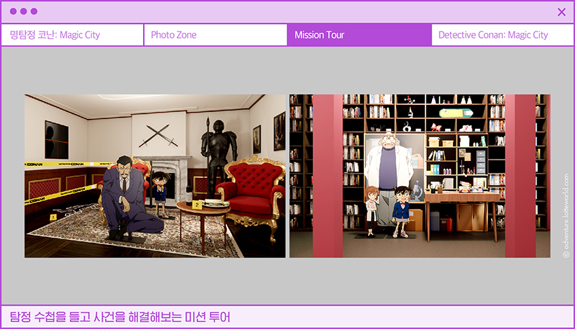 <명탐정 코난: 매직시티>에서는 미란이 아빠 유명한의 탐정 사무소, 어린이 탐정단의 조력자 브라운 박사의 연구실, 고등학생 남도일을 초등학생으로 만들어버린 검은 조직의 위스키 바 등 명탐정 코난의 애니메이션 세계관을 그대로 재현한 포토존을 만날 수 있다. 코난 또는 어린이 탐정단이 되어 폴리스 라인 너머 사건 현장의 숨겨진 증거와 사건의 실마리를 찾는 체험존도 마련됐다.