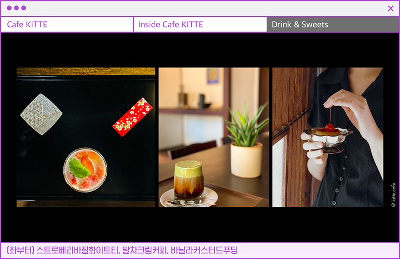 더운 여름, 카페 킷테의 멋진 정원을 눈에 가득 담을 수 있는 테라스에 앉아 말차크림커피를 마실 것을 추천한다. 진한 커피에 부드러운 말차 크림을 올린 카페 킷테의 시그니처 메뉴로 잠깐이나마 일본 교토의 다도실에 와있는 기분을 느낄 수 있다.