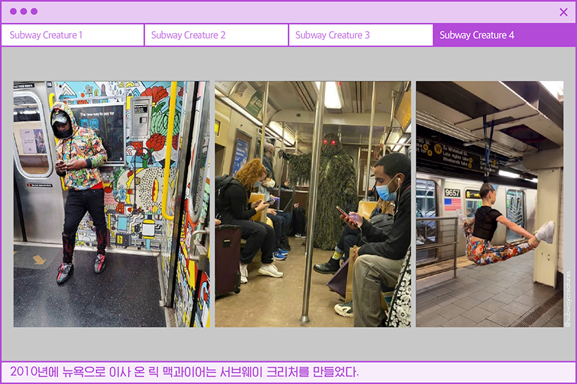 강한 자만이 살아남는다는 수도권 지하철 1호선. 우리나라에 1호선 빌런이 있다면 미국 뉴욕에는 서브웨이 크리처(Subway Creature)가 있다. 서브웨이 크리처는 미국의 컨텐츠 크리에이터 릭 맥과이어가 운영하는 인스타그램 계정으로 팔로워가 300만 명에 달한다. 이름 그대로 뉴욕의 지하철에서 만날 수 있는 별난 사람들과 그 외의(?) 탑승객을 다룬다.