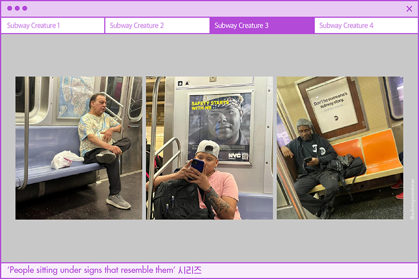 서브웨이 크리처의 다양한 컨텐츠 중 Editor X의 최애는 ‘People sitting under signs that resemble them’. 지하철 광고판과 바로 그 광고에서 튀어나온 것 같은 탑승객의 모습을 모아둔 시리즈인데 절묘하게 들어맞는 모습에 실소가 터진다. 오늘도 빌런이 활개 치는 지옥철에 몸을 싣고 퇴근할 구독자님들께 서브웨이 크리처 계정을 추천한다.