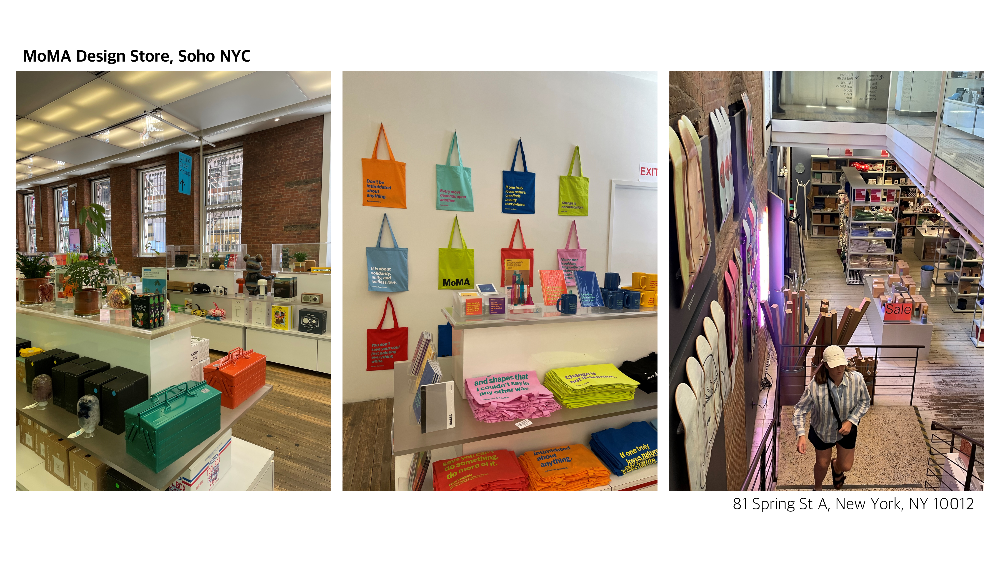 긴 웨이팅으로 모마 미술관을 놓쳐 아쉽다면, 소호에서도 모마의 감각을 느낄 수 있다. 단순한 모마 굿즈뿐만 아니라 일층에서는 키친, 데스크를 꾸밀 수 있는 아이템을, 지하 일층으로 내려가면 조명, 가구, 아이들을 위한 창의적인 장난감까지 만날 수 있다. 소호 모마 디자인 스토어를 구글맵에 치면 뉴욕의 선물가게로 등록돼 있다. 나 자신뿐만 아니라 누군가에게 선물해주고 싶은 귀여운 디자인 아이디어들이 넘쳐나는 곳이다. 형형색색 모마 특유의 컬러와 고딕한 폰트로 적혀 있는 영문의 물건들은 지갑을 열기에 충분하다.
