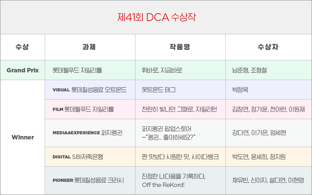 1984년 막을 올린 뒤 수많은 수상자와 광고 전문가를 배출하며 예비 크리에이터들의 축제로 자리매김한 DCA가 제41회를 맞았습니다. 만 28세 이하의 대학생이라면 누구나 지원할 수 있는 이번 공모전은 7월 22일부터 7월 26일까지 진행됐으며 총 1,439편의 작품이 접수됐고 4,151명의 예비 크리에이터들이 참여했습니다.