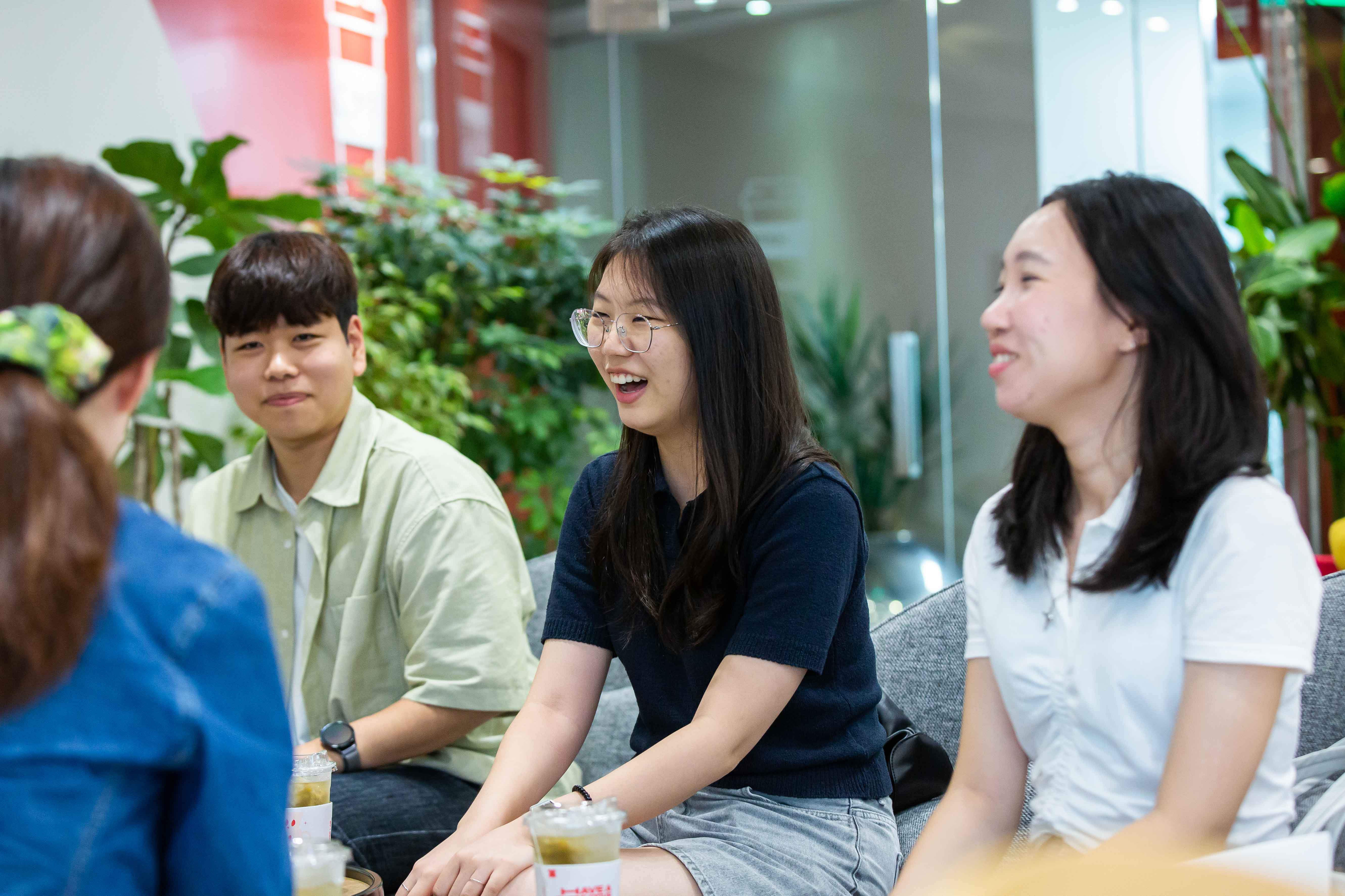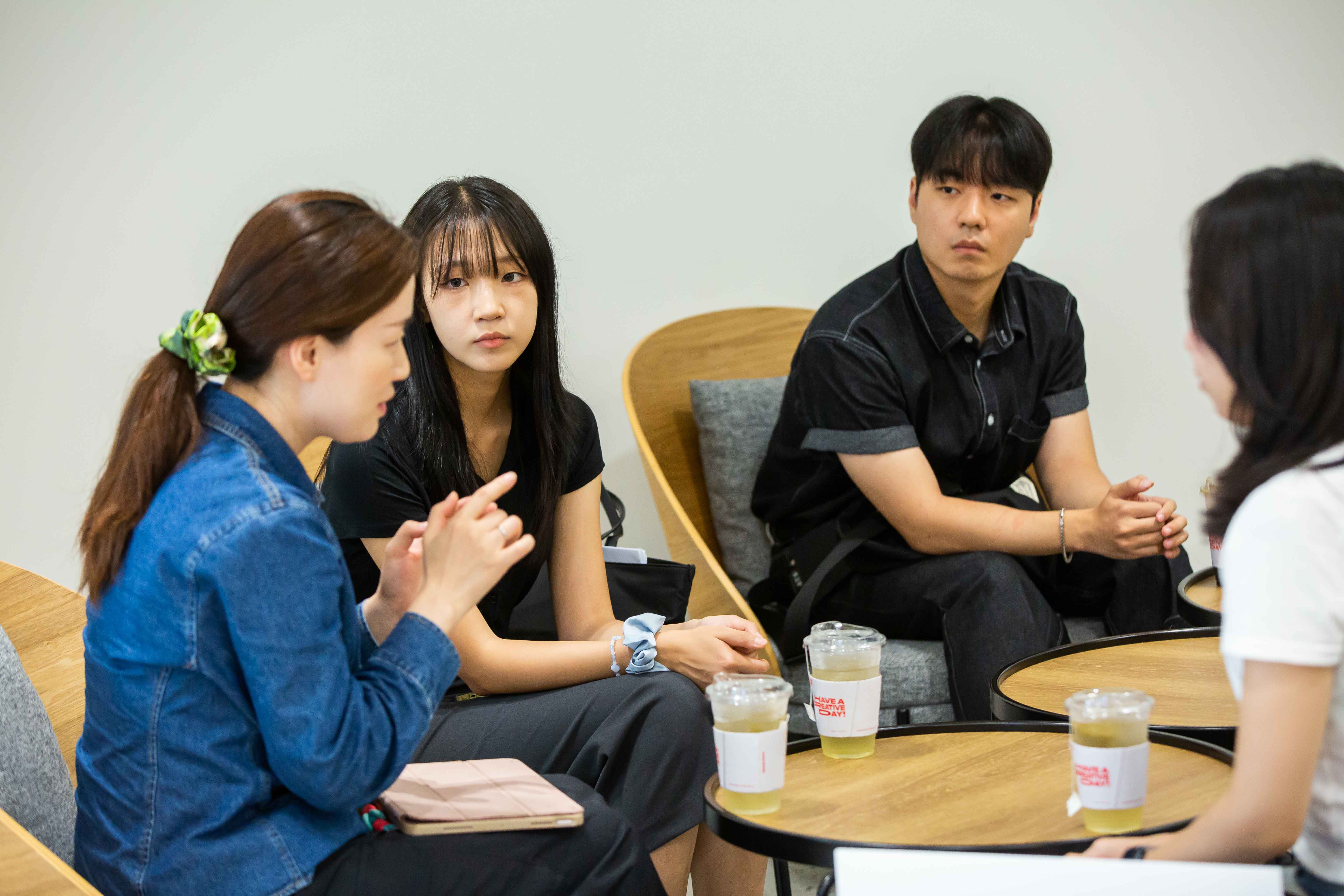 시상식을 마친 뒤에는 사내 카페 CⓔM터에서 ‘광고인의 대화’ 커피챗이 진행됐습니다. 사전에 DCA 수상자들에게 AE, 카피라이터, 아트디렉터 등 희망하는 직무를 받은 뒤 해당하는 대홍기획 멘토들과 대화하는 시간을 가졌는데요. 수상자들은 그간 궁금했던 점을 묻고, 멘토들은 실제 도움이 될만한 조언을 나누며 알차게 마무리했습니다.