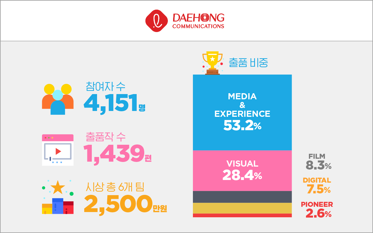 이에 걸맞게 올해는 총 5개의 카테고리제 출품 방식을 도입했습니다. 빠르게 변화하는 매체 환경 속에서 최근 새롭게 주목받는 매체를 다채롭게 활용하려는 의도입니다. 대홍기획 내부에서도 직무 간 경계를 나누기보다 직무순환과 협업을 통해 아이디어를 내는 만큼 기획서와 작품(제작물)으로 구분했던 작년과 달리 참가자의 아이디어와 크리에이티브를 중심으로 평가했습니다.