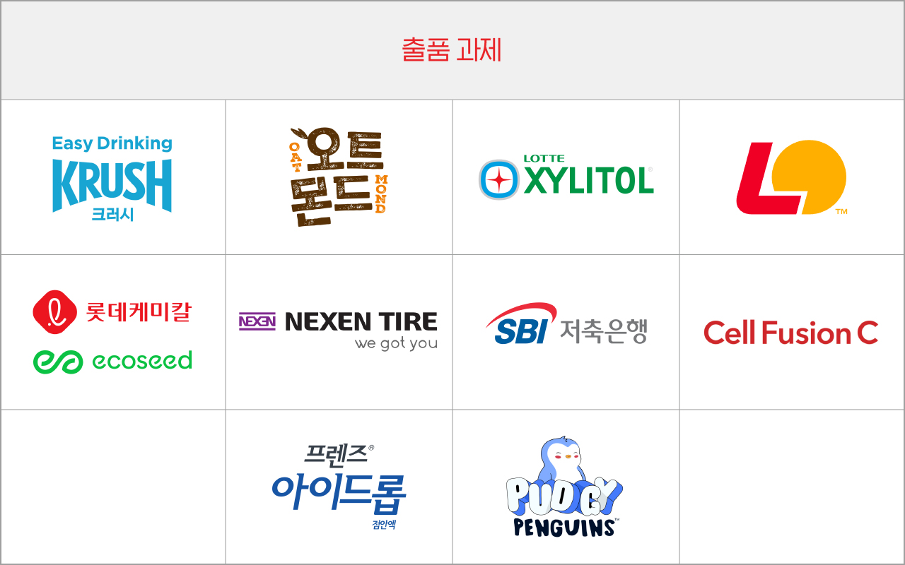 출품 브랜드는 총 10개로 크러시, 오트몬드, 자일리톨, 롯데리아, 롯데케미칼, 넥센타이어, SBI저축은행, 셀퓨전씨, 프렌즈아이드롭, 퍼지펭귄 중 하나를 선택해 가장 적합한 카테고리에 출품작을 제출하도록 했습니다.
