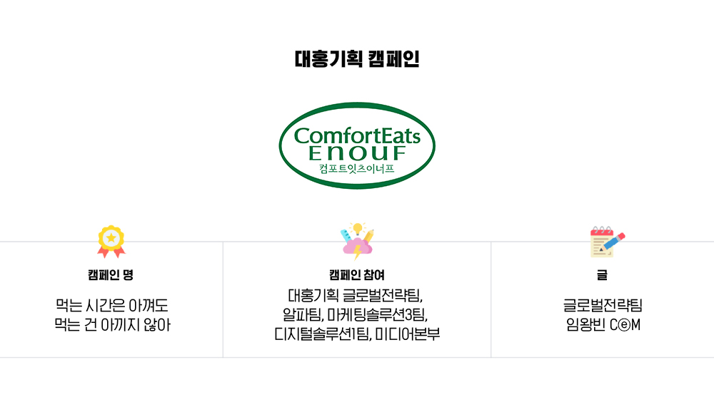 이번 캠페인을 준비하면서 서두에 가장 많은 공을 들였던 부분은 명확한 타깃 설정이었습니다. 단순히 인구통계학적인 분류가 아니라 실제 소비자들의 식사습관과 변화된 식사 트렌드를 탐구했고, 우리의 타깃이 점심시간을 더 이상 직장생활의 연장이 아닌 개인시간으로 인지하고 있음을 발견했습니다. 먹는 것보다 하고 싶은 것이 우선이 되는 타깃을 ‘라이프 퍼포머(Life Performer, 내 방식의 건강한 삶을 위해 하루 일과와 시간을 주도적으로 꾸리며 살아가는 이들)’로 규정하고, 그들을 위해 탄생한 ‘컴포트잇츠이너프’가 어떠한 베네핏을 줄 수 있을지 광고 속에 담아내고자 했습니다.