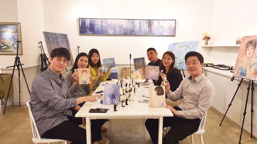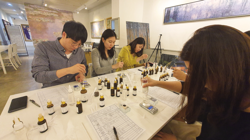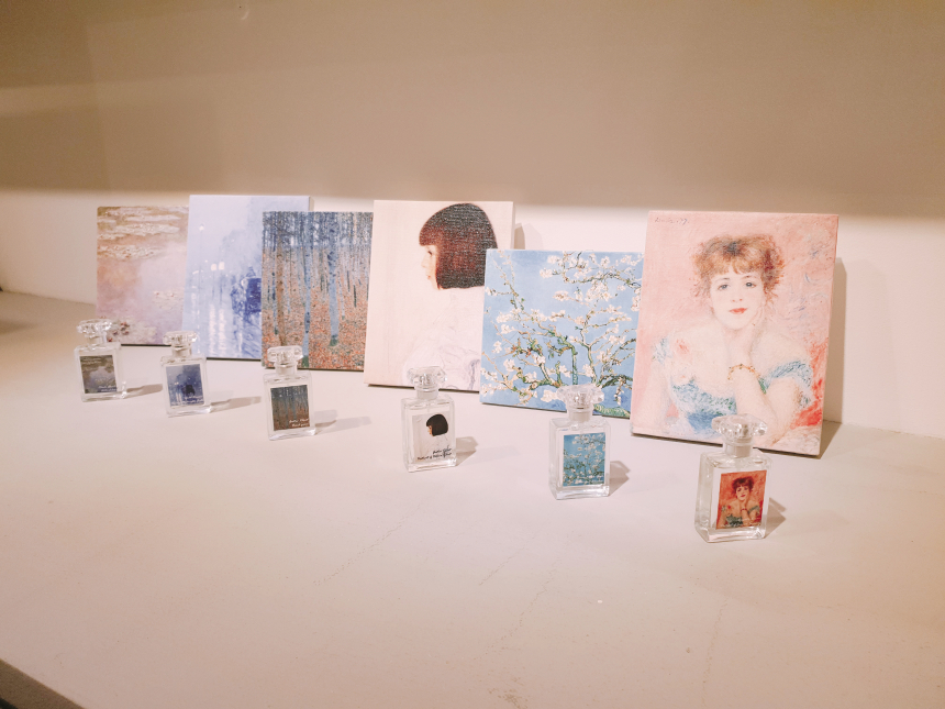 어렵게 서로의 시간을 맞춘 만큼, 마음의 힐링과 더불어 특별한 경험을 하고 싶었고 그래서 우리는 파주의 헤이리스에서 나만의 항수 만들기 클래스에 참여했다. 예전부터 조향 클래스에 관심이 많았는데, 이곳의 향수 만들기는 여러 명화 중, 마음에 드는 그림을 선택하고 그 그림과 어울리는 향과 나의 취향에 맞는 향을 만드는 미학적인 조향 클래스여서 더욱 매력적이었다. 향의 이름을 감추어서 온전히 감각에 집중하여 향을 고르는 형태였기에, 지금 이 향이 어떤 느낌인지 서로 이야기하면서 나만의 향수를 만들어가는 과정이 정말 재미있었다! 내가 선택한 그림은 고흐의 아몬드 꽃. 청록색에서 오는 싱그러운 느낌과 아몬드꽃에서 느껴지는 은은함을 표현하기 위한 머스크, 그리고 플로럴한 향에 끝으로 나뭇가지의 우디한 향을 섞어 나만의 향수를 만들었다. 이후 2층의 갤러리에서 명화와 그에 어울리는 향수를 같이 감상하고 단체사진도 뿌듯하게 한 컷.