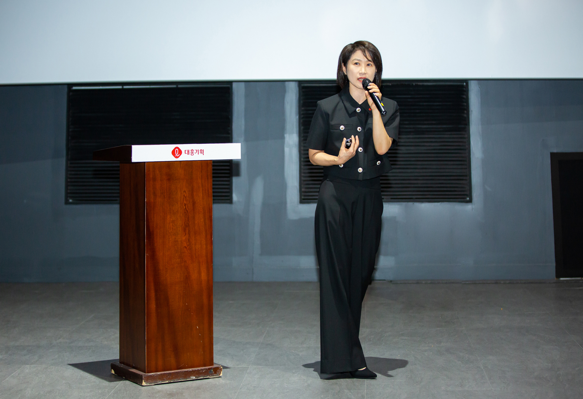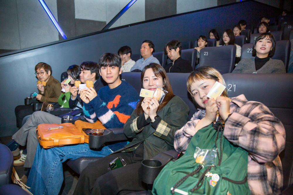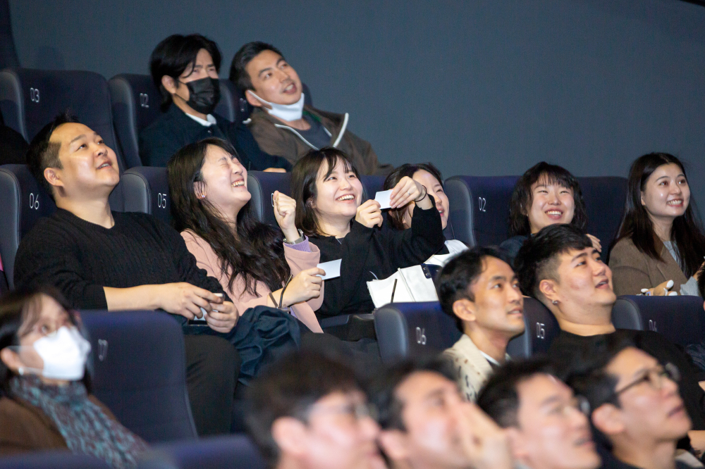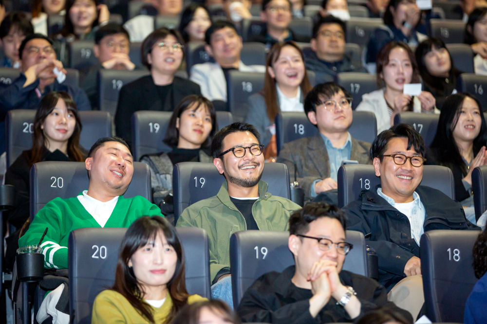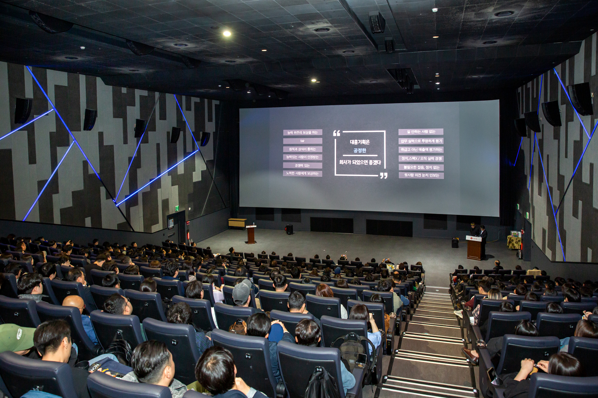 잠실 롯데시네마 월드타워점, 아침을 깨우는 커피와 쿠키를 받아든 구성원들이 속속 자리를 잡습니다. 영화의 시작을 기다리듯 모두의 설렘이 커져갈 무렵 널찍한 스크린에 영상이 재생되기 시작했습니다. 포스코, 넥센타이어, 롯데카드, 하나은행, 삼성생명 등 올 상반기에 대홍기획이 제작한 콘텐츠가 연이어 화면을 채웠습니다. 이어서 마이크를 잡은 조항준, 김태윤 CⓔM, 선글라스에 머리장식까지 위트 넘치는 모습으로 행사의 시작을 알렸습니다.