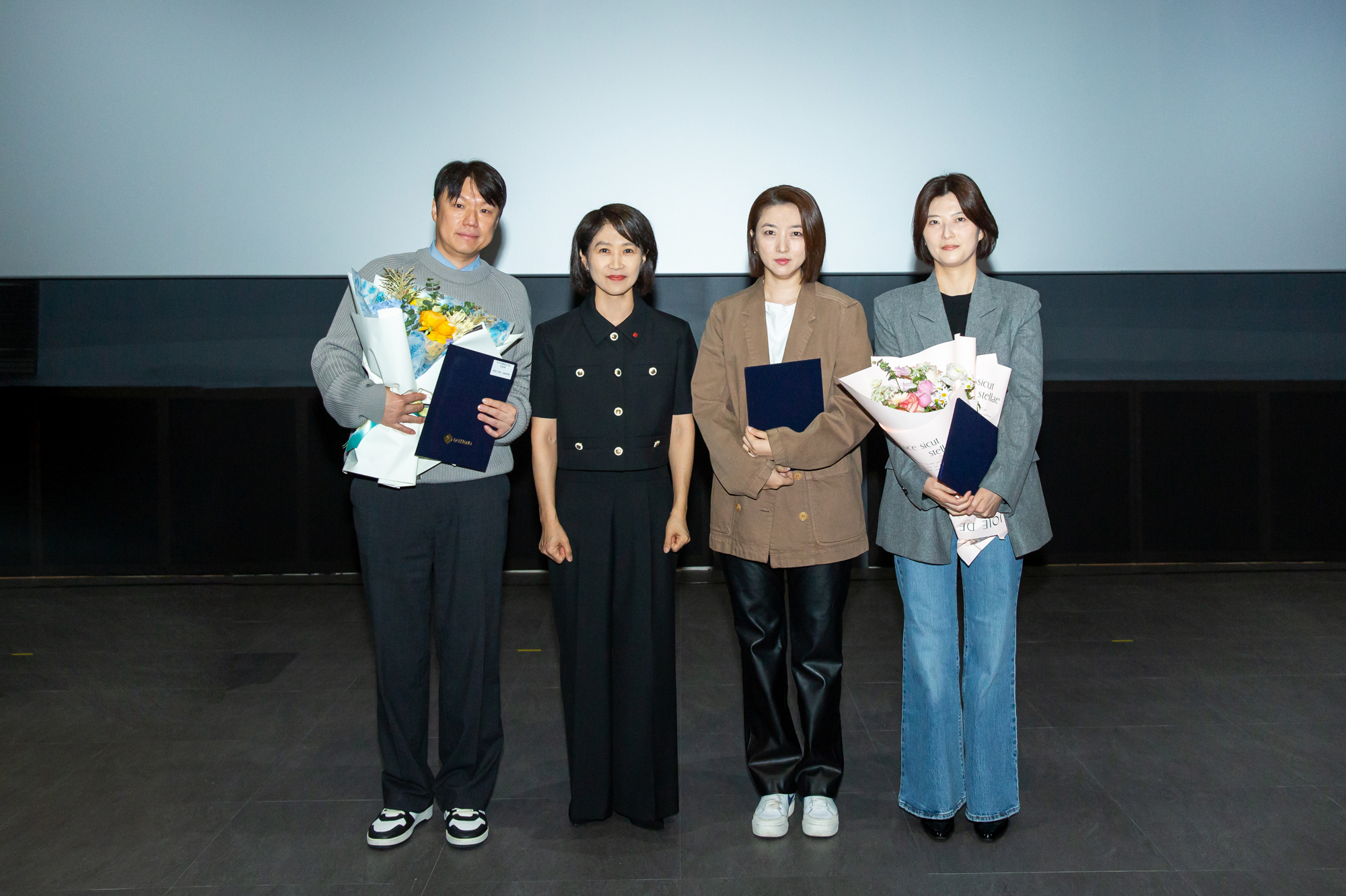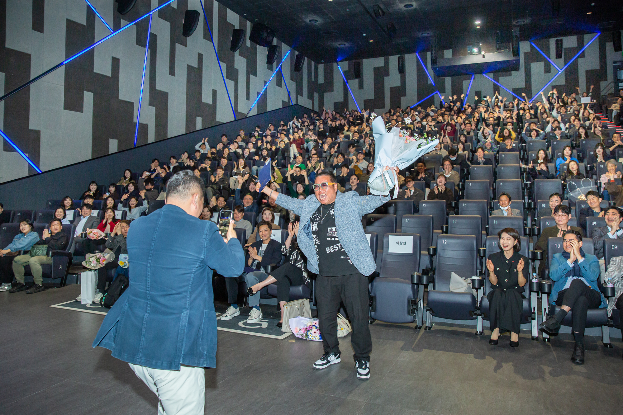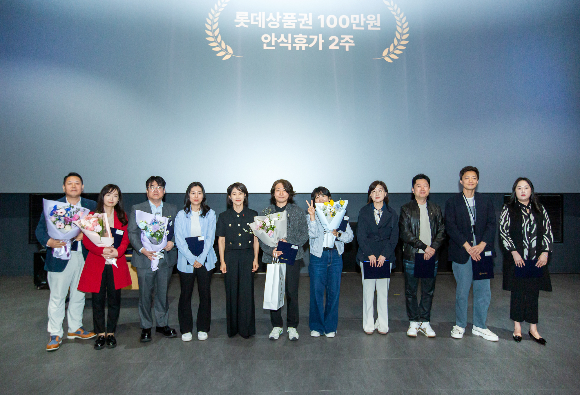 잠실 롯데시네마 월드타워점, 아침을 깨우는 커피와 쿠키를 받아든 구성원들이 속속 자리를 잡습니다. 영화의 시작을 기다리듯 모두의 설렘이 커져갈 무렵 널찍한 스크린에 영상이 재생되기 시작했습니다. 포스코, 넥센타이어, 롯데카드, 하나은행, 삼성생명 등 올 상반기에 대홍기획이 제작한 콘텐츠가 연이어 화면을 채웠습니다. 이어서 마이크를 잡은 조항준, 김태윤 CⓔM, 선글라스에 머리장식까지 위트 넘치는 모습으로 행사의 시작을 알렸습니다.