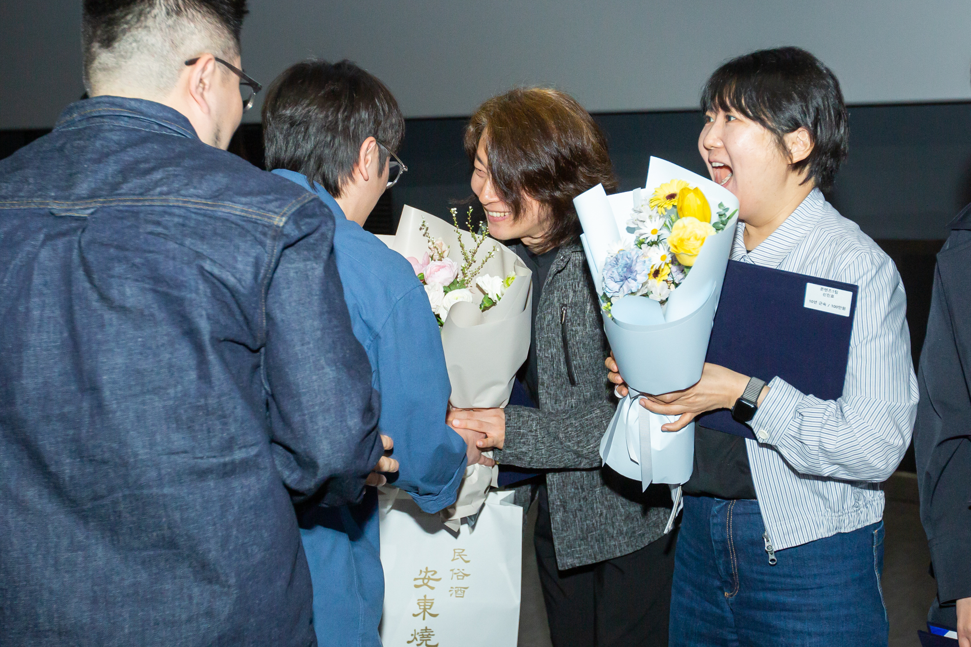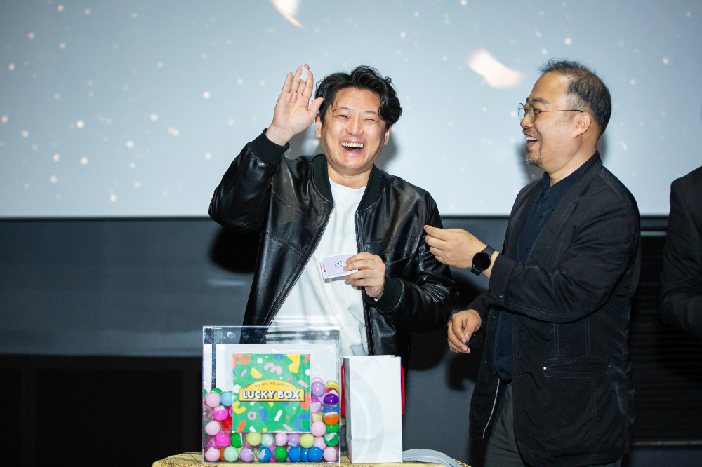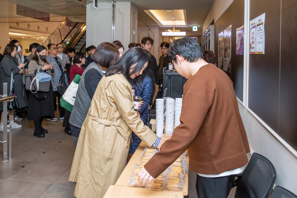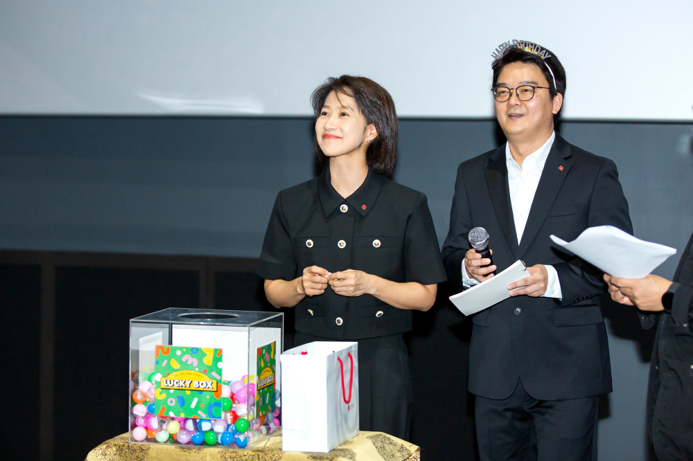 다음은 창립 43주년을 축하하는 럭키드로우 이벤트입니다. 올해에도 다양한 경품이 준비돼 행운을 기다리는 구성원의 설레는 마음이 느껴졌는데요. 몸풀기 깜짝 퀴즈와 입장 시 받았던 커피 슬리브 안쪽에 표시된 랜덤 당첨까지, 곳곳에서 웃음과 탄성이 이어졌습니다. 드디어 시작된 본격적인 행운 추첨의 시간! 올해에는 대홍기획이 만든 마케팅 전용 올인원 AI 시스템인 에임스(AIMS: AI Marketing System)가 행운권 번호를 선정해 기대감을 높였습니다. 입장할 때 랜덤으로 배포된 행운티켓 번호를 손에 꼭 쥐고 화면에 나열된 번호와 맞춰보는 구성원들. 이어서 더 큰 행운을 가릴 럭키박스가 등장했습니다. 알록달록한 공 안에 들어있는 번호가 무엇일지 모두 숨죽여 기다리는 모습입니다. 쿠쿠 밥솥, 위스키, 포토프린트, 애플워치, 시그니엘서울 식사권 등 번호가 불릴 때마다 짜릿한 표정이 더해졌습니다.