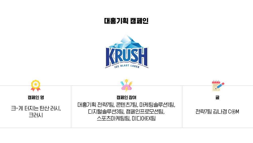 핵심 RTB는 탄산볼륨 3.3으로 클라우드보다 22% 높은 강력한 탄산압과 시원한 맛을 크러시답게 타깃의 언어로 맥주를 ‘크-’ 하고 마시는 리추얼로 표현하고, 캠페인 메인 슬로건을 ‘크-게 터지는 탄산 러시’로 잡았다.