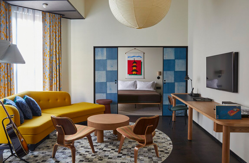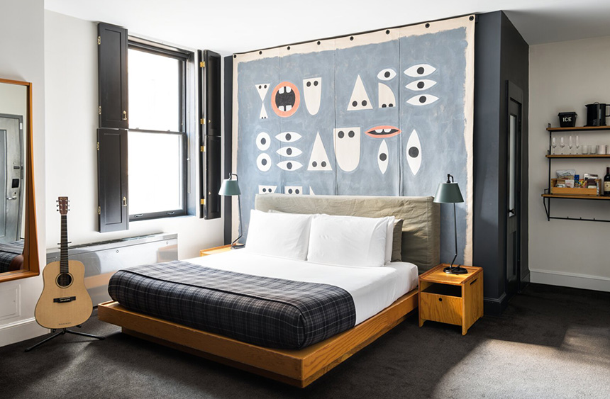 이를 테면 에이스호텔 브루클린의 객실은 뉴욕의 힙한 스튜디오처럼 멋스럽다. 격자창 너머로는 햇살이 스미고 빈티지한 소파와 턴테이블, TV 옆에 무심하게 놓인 기타에서는 아날로그 감성이 묻어난다. 이런 공간에 머물다 보면 호텔이 아니라 ‘뉴욕의 힙한 동네 브루클린의 집에 살아보는 기분’을 만끽할 수 있다. 이런 이유로 에이스호텔에 체크인한다는 것은 그 도시에 체크인하는 것과 같다.