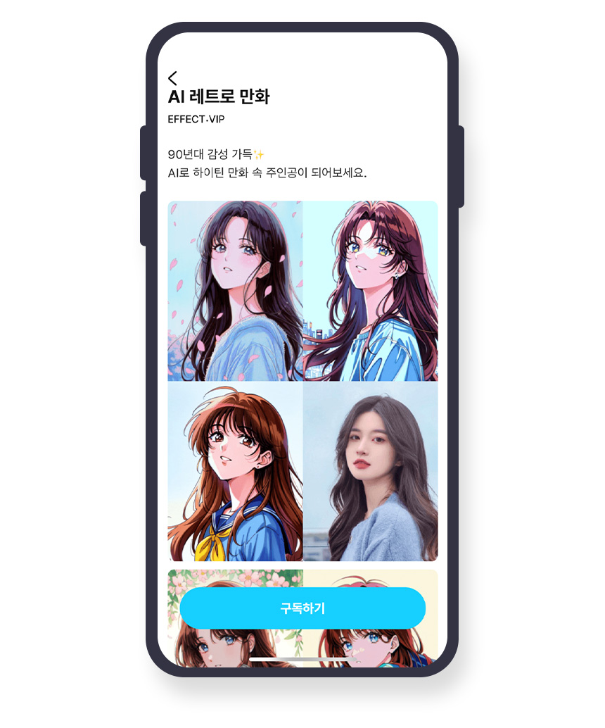 AI 프로필 기능을 출시한 후 폭발적인 인기를 끌었던 스노우. 수많은 유저들의 SNS 프로필 화면을 차지하기도 했습니다. 스노우가 출시한 ‘AI 만화동산’ 서비스는 1990년대 방영됐던 애니메이션 ‘디즈니 만화동산’이 모티브인데요. 나만의 캐릭터가 만들어지는 데다가 90년대의 레트로한 분위까지 구현해 하나의 트렌드가 됐습니다.