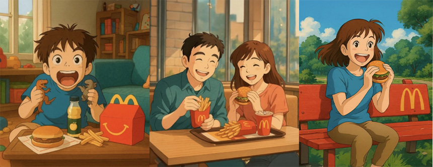 맥도날드 멕시코는 공식 페이스북 페이지에 일명 ‘지브리 스타일’의 이미지를 여러 장 게시했습니다. 게시물 속 이미지에는 ‘지브리 스타일’의 캐릭터들이 맥도날드의 대표 메뉴를 즐기는 모습이 담겨 있습니다. 해당 게시물은 수천 건의 좋아요와 공유를 기록하며 순식간에 퍼졌지만, 동시에 국내외 커뮤니티와 언론에서 AI 창작물의 저작권 문제를 재점화시키는 계기가 됐습니다.