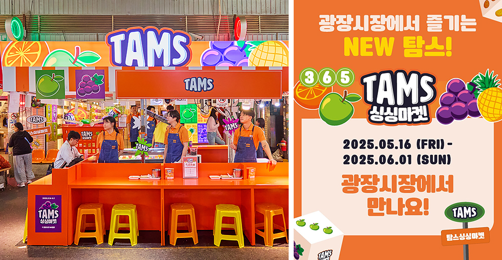 새로워진 탐스를 소비자가 직접 경험해 볼 수 있는 오프라인 팝업스토어도 운영했습니다. 탐스의 ‘잘 익은 탄산의 맛’이라는 키 메시지에 공감할 수 있는 장소 선정이 중요했습니다. 이를 위해 Gen-Z 세대에게 특화된 광장시장과 협업해 ‘탐스싱싱마켓’을 오픈하게 됐습니다. 팝업스토어에서는 탐스를 시음해 볼 수 있을 뿐 아니라 ‘탐스 부채 DIY’와 ‘과일 무게 맞추기’ 등을 통해 과일 가게 컨셉과 연결된 브랜드 경험을 제공했습니다.