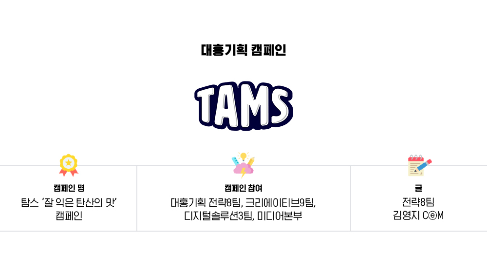 ‘잘 익은 탄산의 맛’이라는 키 메시지에 집중해 캠페인 영상과 오프라인 프로모션, 그리고 인플루언서 콘텐츠까지. 하나의 일관된 컨셉으로 엮어낸 이번 탐스 캠페인을 통해 확장된 라인업과 풍부해진 맛으로 리뉴얼된 탐스를 전달할 수 있었습니다. 앞으로 펼쳐질 새롭고 다양한 마케팅 활동도 많이 기대해주세요!