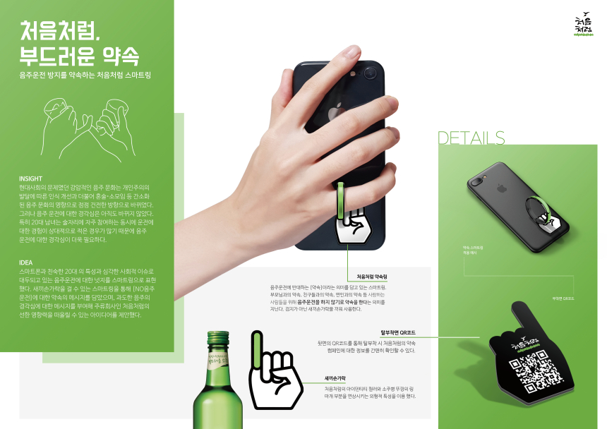 저는 주제를 정해놓고 아이디어를 발전시키는 타입이 아니라, 주변 사물을 보고 갑자기 아이디어가 떠오르면 그때부터 작업을 하는 타입인데요. 처음처럼도 맨 처음엔 소주잔이나 술병을 웃도는 다른 아이디어가 마땅히 떠오르지 않았습니다. 그러던 와중에 동생이 준 스마트폰 링을 받게 되었는데 이것을 너무 낮게 붙여버려서 새끼손가락에 끼우게 되었습니다. 떼고 다시 붙이려다 문득 '새끼손가락에 스마트링을 끼우면 어떨까? 꼭 약속하는 것 같네'하는 생각이 떠오르게 되었고, 바로 아이디어를 발전시켜보았습니다. 20대와 떼려야 뗄 수 없는 스마트폰에 연계된 스마트 링이라는 사물을 통해 20대의 음주문화에 대한 메시지를 전달할 수 있을 것이라 생각했고, 이를 통해 [약속-올바른 음주문화]라는 행위를 직관적으로 드러낸다면 주류회사가 가지는 선한 영향력을 소비자들에게 보여줄 수 있을 것이라고 판단했습니다. 아이디어를 도출할 때 저의 이러한 즉흥적인 면 때문에 덕을 본 것 같습니다. 심사위원 분들도 그런 직관성이나 메시지를 좋게 봐 주신 것 같아서 감사할 따름입니다.