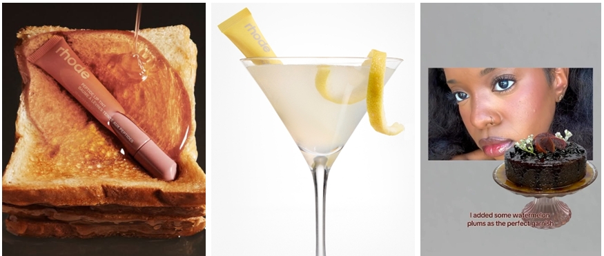 뷰티 브랜드 로드(Rhode)를 살펴보자. 헤일리 비버가 만든 로드는 현재 350만 명 이상의 인스타그램 팔로워를 보유하고 있다. 브랜드의 이미지 및 캠페인에서는 케이크, 페이스트리, 달콤한 간식 등 디저트에서 영감 받은 시각적 요소들이 반복적으로 등장한다. ‘바닐라 케이크’라는 이름의 펩타이드 립 트리트먼트인 ‘슈가 쿠키’ 립밤처럼 디저트명을 제품명에 반영하고, 실제 디저트와 함께 촬영하거나 나란히 배치하는 방식으로 브랜드 특유의 감각적 세계를 구축했다. 반짝이며 쫄깃하게 보이는 텍스처를 강조함으로써 스킨케어 루틴을 탐닉할 수 있는 즐거운 경험으로 탈바꿈시켰다.