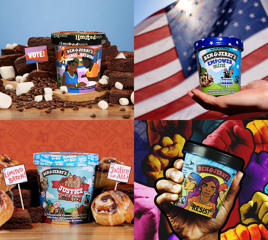 이렇듯 벤앤제리스는 ‘세계에서 가장 적극적으로 브랜드 행동주의를 강조하고 실천하는 기업’이라는 평가를 받고 있다. 그들은 한때 정치권에서도 목소리를 냈는데, 2016년 대선 당시 진보 성향의 민주당 후보인 버니 샌더스를 지지하며 ‘Bernie’s Yearning(버니의 열망)’이라는 이름의 제품을 출시했다. 윗부분의 초콜릿은 상위 1%를, 아래 민트 아이스크림은 하위 99%를 상징해 초콜릿을 깨뜨려 민트와 혼합해 먹도록 하는 의도를 담고 있다. 2019년 9월에는 흑인과 소수인종 모두에게 평등한 형사법 개혁을 요구하면서 ‘Justice Remix’d’라는 메뉴를 출시하기도 했다.