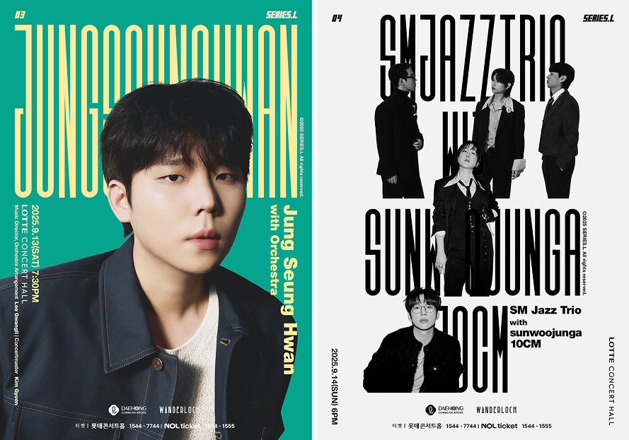 ‘시리즈L : 정승환’ 공연은 오는 9월 13일(토) 오후 7시 30분, ‘시리즈L : SM 재즈 트리오 with 선우정아, 10CM’ 공연은 9월 14일(일) 오후 6시에 롯데콘서트홀에서 개최된다. 티켓 예매는 정승환 공연이 8월 18일(월), SM 재즈 트리오 with 선우정아, 10CM 공연이 8월 19일(화)부터 롯데콘서트홀, NOL티켓에서 진행된다.
