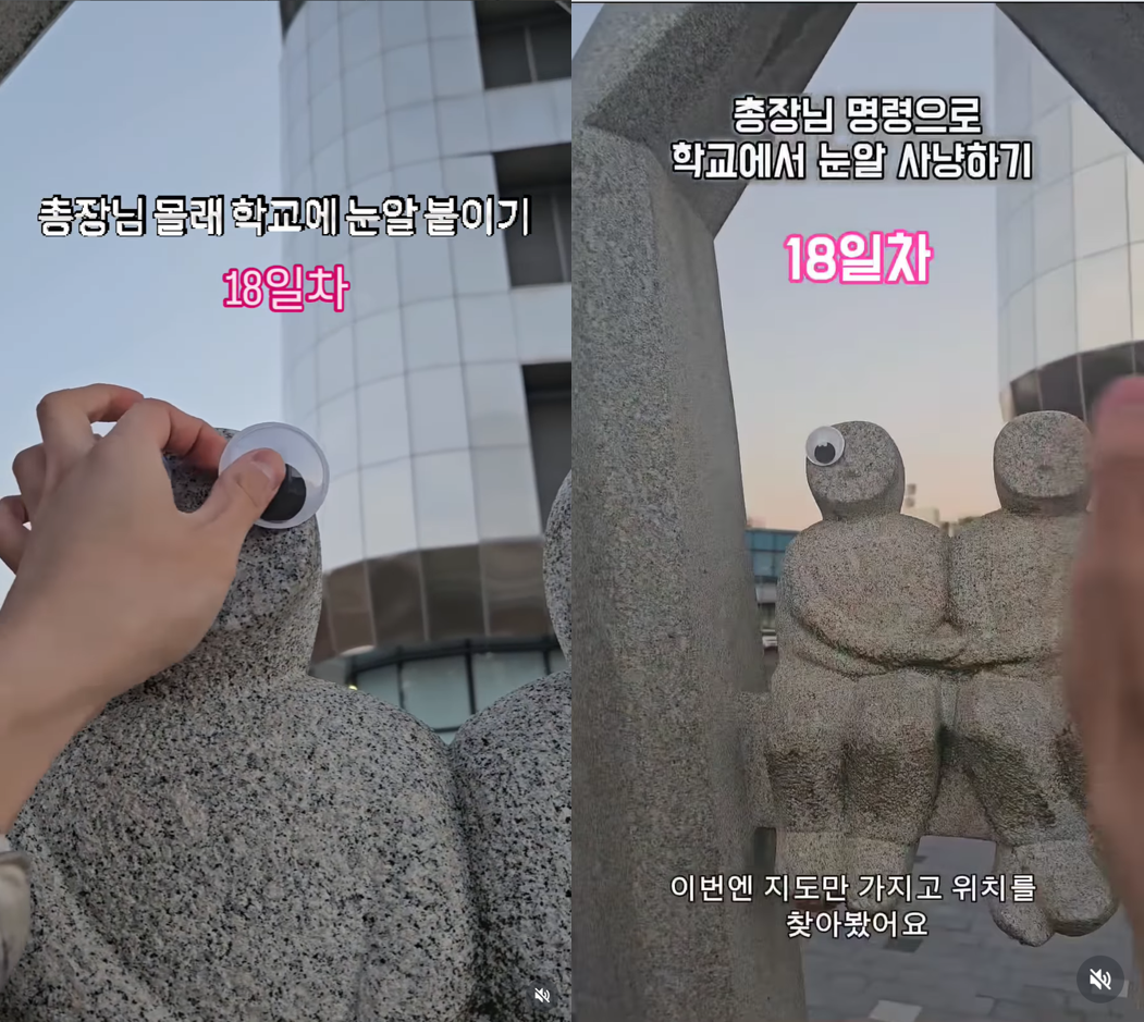 엉뚱하고 기발한 대학생의 인스타그램 계정이 화제입니다! 바로 ‘총장님 몰래 학교에 눈알 붙이기’ 계정인데요. 야외 석상부터 주차장 게시판, 나무까지 학교 곳곳의 기물에 눈알 스티커를 붙이는 영상을 올리고 있습니다. 현재, 이 프로젝트는 28일째 진행 중인데요. 눈알을 붙이는 범인(?)은 잡히지 않았지만, 여러 단서를 통해 장소가 카이스트 캠퍼스라는 사실까지는 밝혀진 상태입니다. 가장 조회 수가 높은 영상은 무려 482만 회를 기록하기도 했어요. 해당 계정이 점점 유명해지자 ‘눈알 사냥꾼’ 계정도 등장했답니다. 사냥꾼은 콘텐츠 속 단서를 기반으로 사냥에 나서는데요, 예를 들어 눈알이 붙은 동상 팻말에 ‘기증’이라는 문구가 있으면 학교 내 기부 관련 건물을 찾는 방식으로 눈알을 떼고 있습니다. 헌터가 사냥에 실패하는 날도 종종 있어요! 다른 학생들이 먼저 눈알을 떼어버리면, 그날 사냥은 실패로 끝납니다. 한편, 눈알 사냥꾼의 “총장님 명령으로 학교에서 눈알 사냥하기”라는 설정도 화제를 모았는데요. 이에 대해 총장님이 직접 남긴 답글이 주목받았답니다. “학교는 놀이터다. 마음껏 상상하고, 시도하고, 즐기는 곳이다.” 이후, 사람들은 각 계정을 응원하며 “총장님 방에도 붙여주세요!”, “헌터 계정, 범인 꼭 잡아주세요!” 같은 유쾌한 반응을 남기고 있어요. 과연 사냥꾼은 범인을 잡을 수 있을까요?