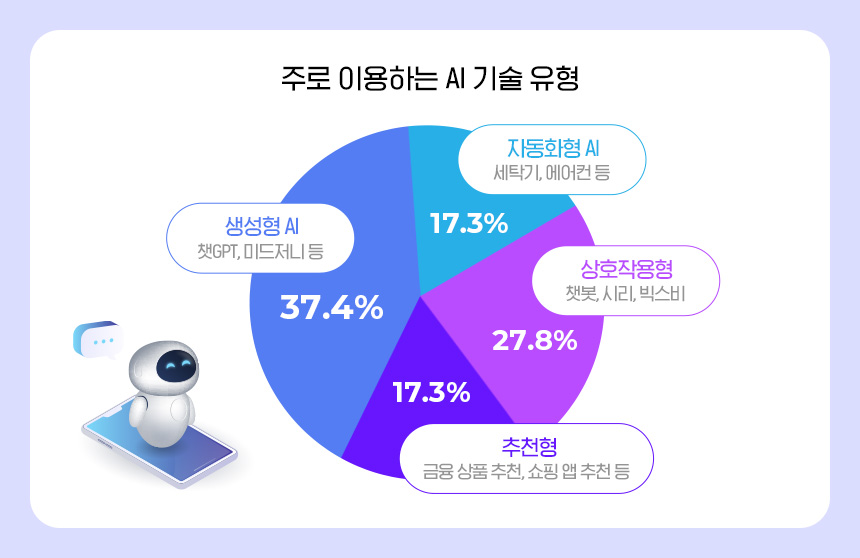 한편, 한국인이 가장 많이 사용하는 AI 기술은 ‘생성형’(37.4%)이었다. ‘상호작용형’이 27.8%, ‘자동화형’과 ‘추천형’이 각각 17.3%로 뒤를 이었다. AI 활용 능력, 비판적 이해, 윤리적 판단 역량을 종합적으로 평가한 AI 리터러시 역량에서도 유의미한 결과를 도출할 수 있었다. AI를 일상에서 효율적으로 활용할 수 있는 역량을 의미하는 ‘AI 활용 능력’이 62.3%로 비교적 높은 반면, AI가 사회적∙윤리적으로 안전하게 작동하는지에 대한 판단 능력인 ‘AI 사회 영향력 판단 능력’은 50.6%에 머물렀다. 이는 향후 국민이 안심하고 AI 기술을 사용할 수 있는 기반이 만들어져야 할 필요성을 보여준다.