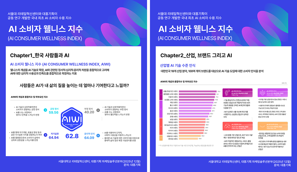 전 국민이 AI를 일상적으로 마주하는 시대에 접어들면서 AI는 산업·공공·생활·문화 등 사회 전반에서 우리 삶과 더욱 밀접하게 연결되고 있다. 이에 대홍기획이 서울대학교 생활과학대학 부설 리테일혁신센터와 국내 최초로 AI 기술에 대한 소비자의 수용도와 삶의 만족도를 통합 측정한 「AI 소비자 웰니스 지수(AI Consumer Wellness Index, AIWI)」를 공동 개발했다. 이번 리포트에는 「AI 소비자 웰니스 지수」 진단 결과와 더불어 18개 산업군, 100여 개 브랜드를 대상으로 한 소비자 AI 기술 인식 조사 결과도 담겼다.