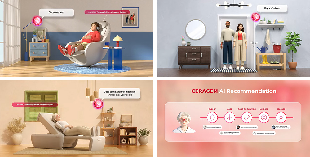 실제 제품 배치와 더불어 세라젬 AI가 추천하는 세대별 제품 사용 가이드를 캐릭터 애니메이션으로 제작했습니다. 복잡한 기능 설명 대신 친근한 영상을 통해 관람객들이 제품의 효용성을 쉽게 이해하고 구체적으로 각인할 수 있도록 했습니다. 해당 영상은 세라젬 공식 유튜브 및 홈페이지 등 다양한 채널에서도 만나보실 수 있습니다.