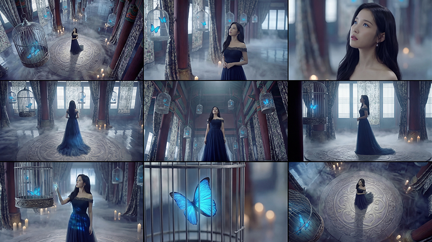 이미지 한 장을 넣으면, 이 장면을 기반으로 다양한 연출 컷을 제안해줍니다. 예를 들어 '나비가 든 새장을 바라보는 여성' 이미지를 넣으면 아래처럼 여러 시점에서 재해석해주죠.
