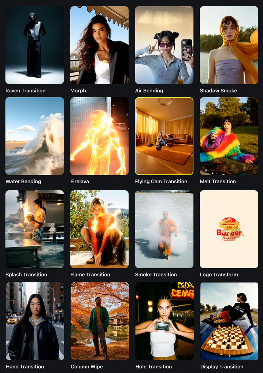 영상 작업에서 은근히 손 많이 가는 과정이 바로 트랜지션(장면 전환)입니다. Transitions 기능은 시작 컷과 엔드 컷을 넣고 사이 효과를 선택하면 전환을 만들어줍니다. 실제 영상에서 쓰이는 전환 기법을 꽤 잘 재현합니다.