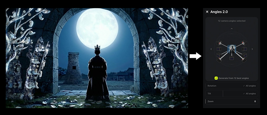 이미지를 넣으면 해당 장면의 다양한 카메라 앵글을 출력해줍니다. 옵션을 선택하면 한번에 여러 앵글을 뽑을 수도 있어요.