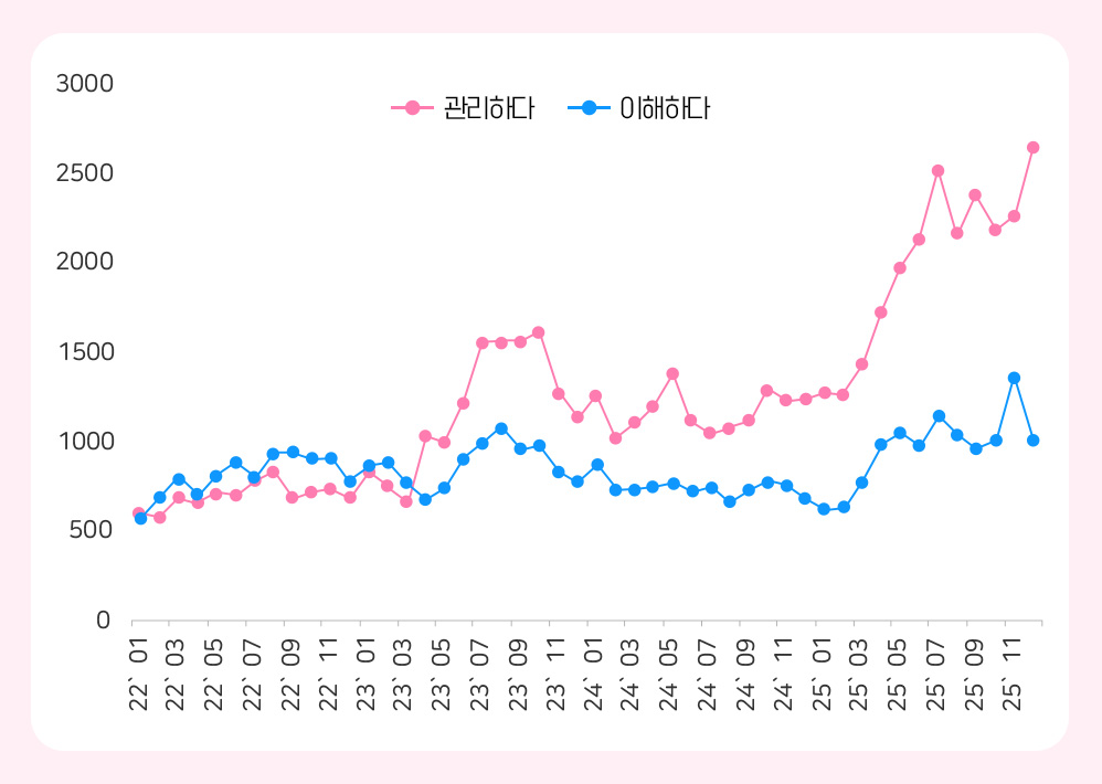 소셜 빅데이터를 통해 '감정 관리’와 ‘감정 이해’의 흐름을 살펴보면 눈에 띄는 변화가 보인다. 2022년 초에는 감정을 '이해’하는 것이 '관리’하는 것보다 앞서 있었다. 그런데 2023년 이후 그 추세가 역전하며 격차가 벌어지기 시작한다. 그렇다면 ‘관리’와 ‘이해’는 어떻게 다른가? “왜 그런지 알았으니 참자”라고 생각하는 태도는 이해에, “왜 그런지 알았으니 조율하자”라고 행동하는 태도는 관리에 가깝다.